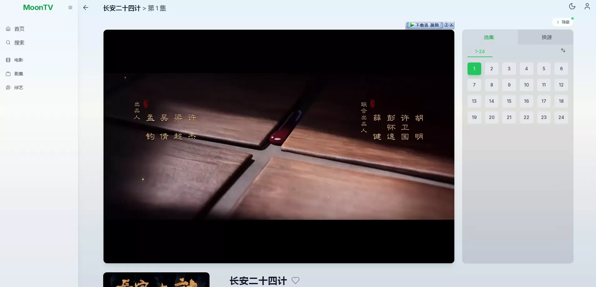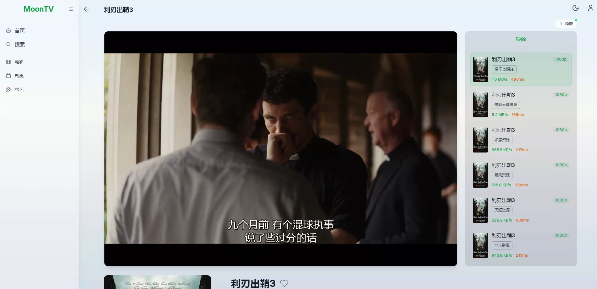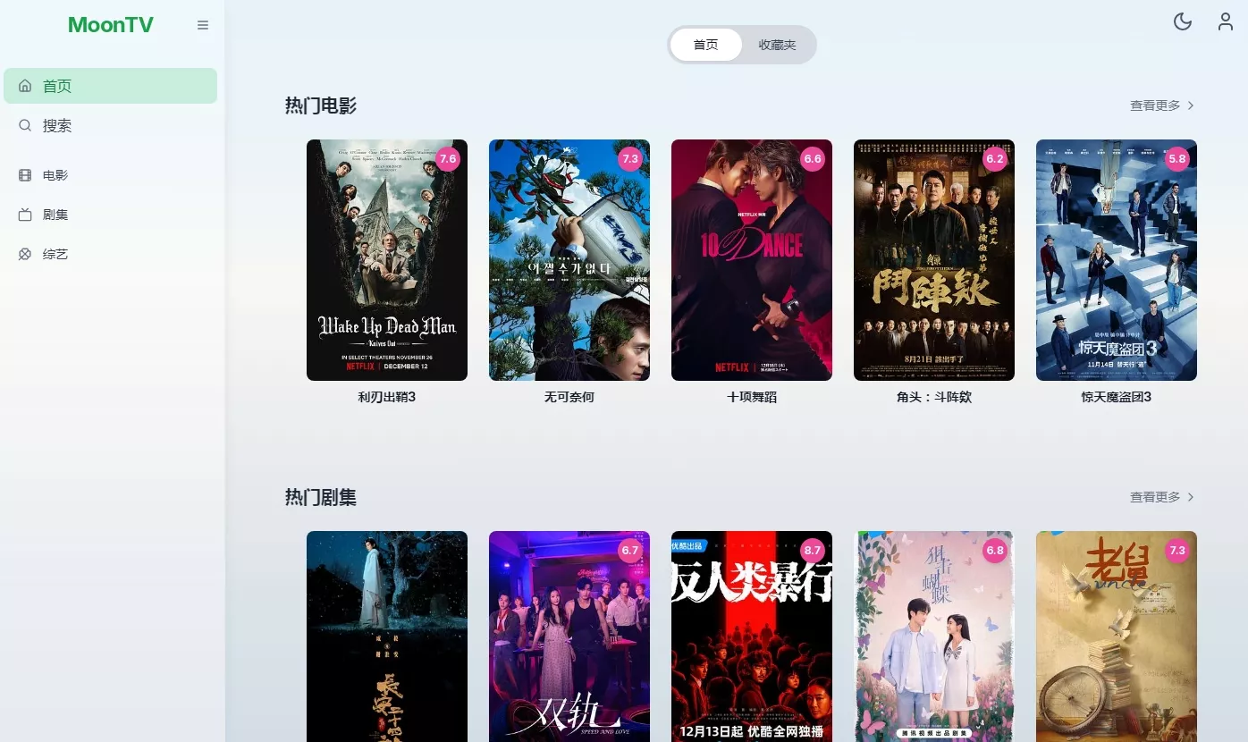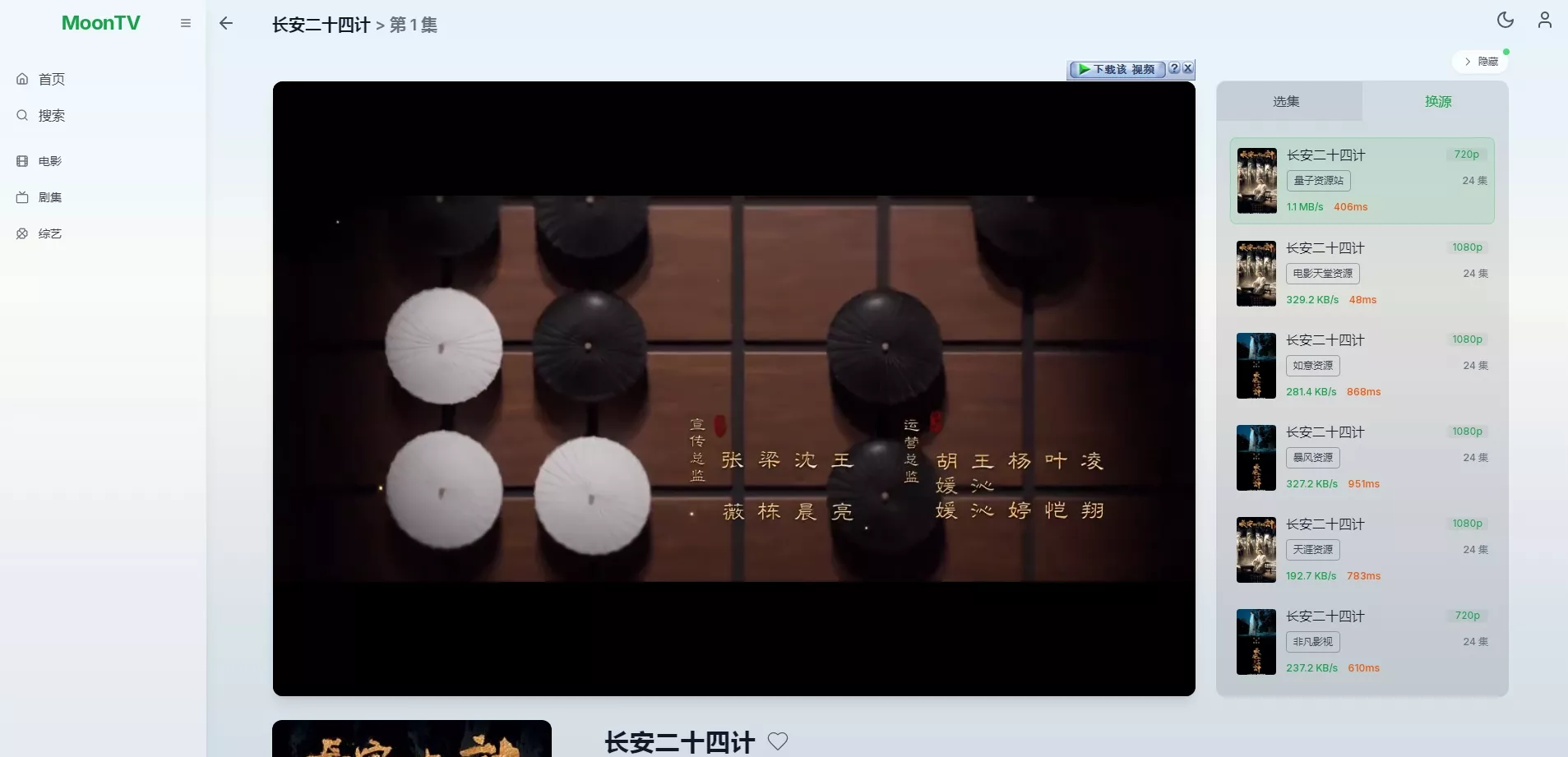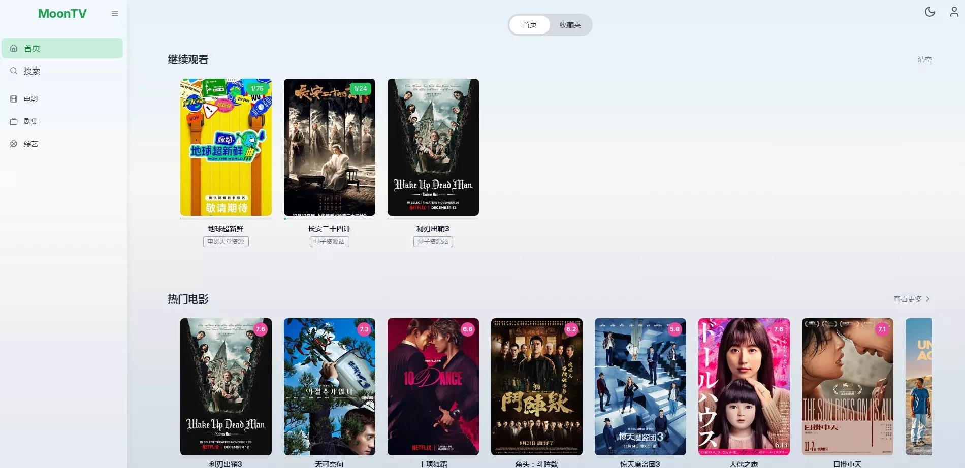 MoonTV 是一个开箱即用的、跨平台的影视聚合播放器。它基于 Next.js 14 + Tailwind CSS + TypeScript 构建,支持多资源搜索、在线播放、收藏同步、播放记录、本地/云端存储,让你可以随时随地畅享海量免费影视内容。